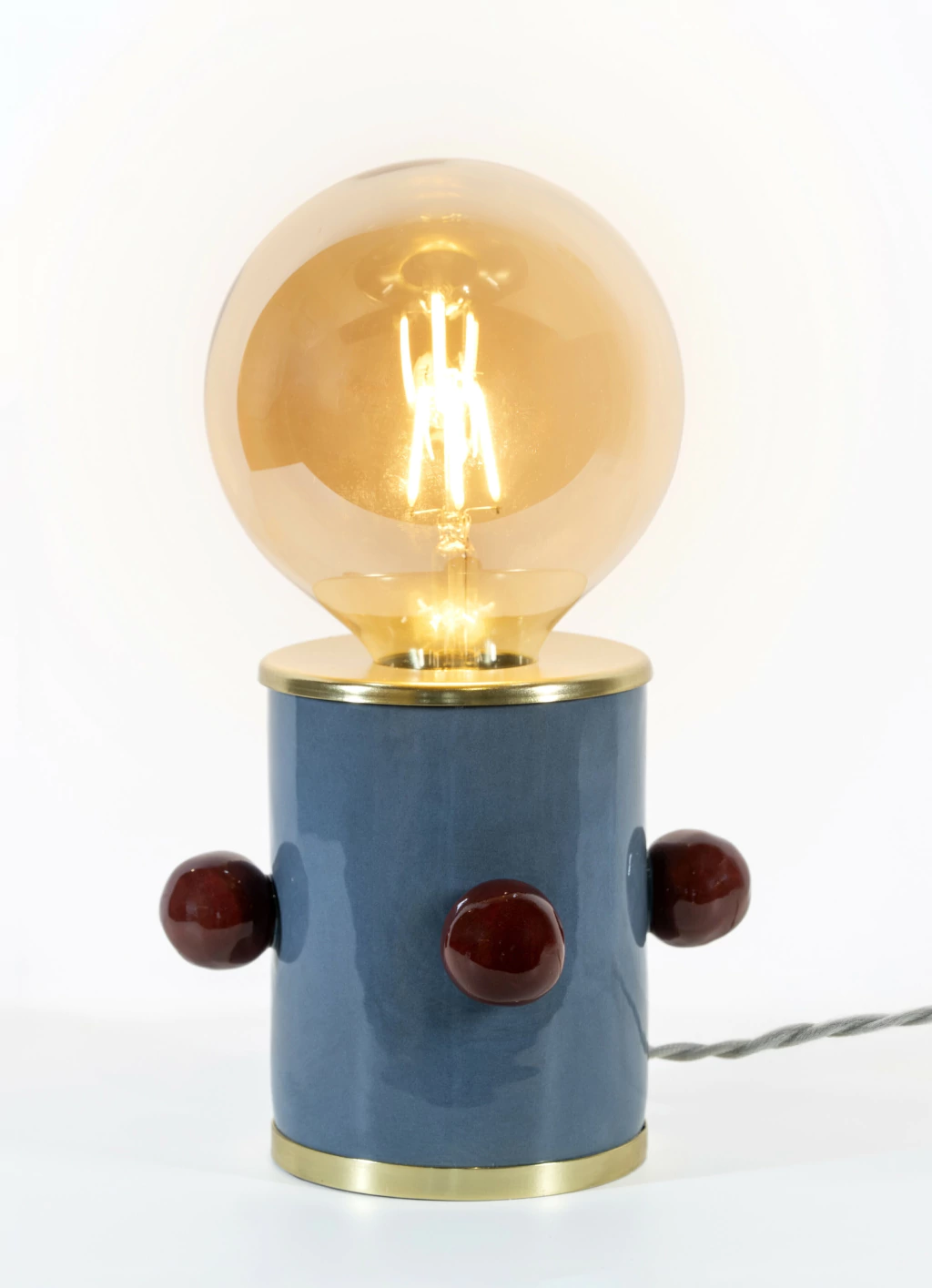 Fruto de uma colaboração exclusiva com o designer Ric Melo, este abajur une design contemporâneo e acabamento artesanal em uma peça única. A base em cerâmica azul recebe detalhes em esferas bordô, criando um contraste marcante e elegante. Os aros em metal dourado reforçam o caráter sofisticado, e a ausência de cúpula tornam-o cheio de modernidade.