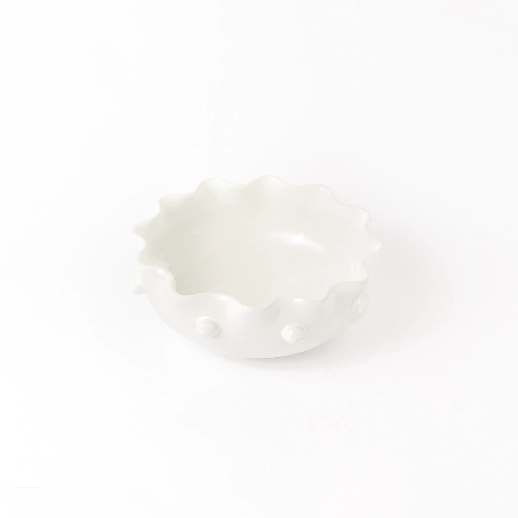 Bowl feito em cerâmica queimada em alta temperatura, com detalhes de bolinhas no mesmo esmalte.