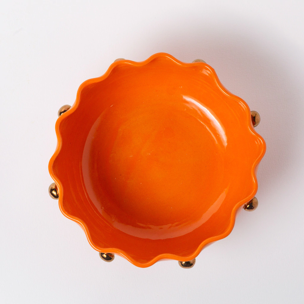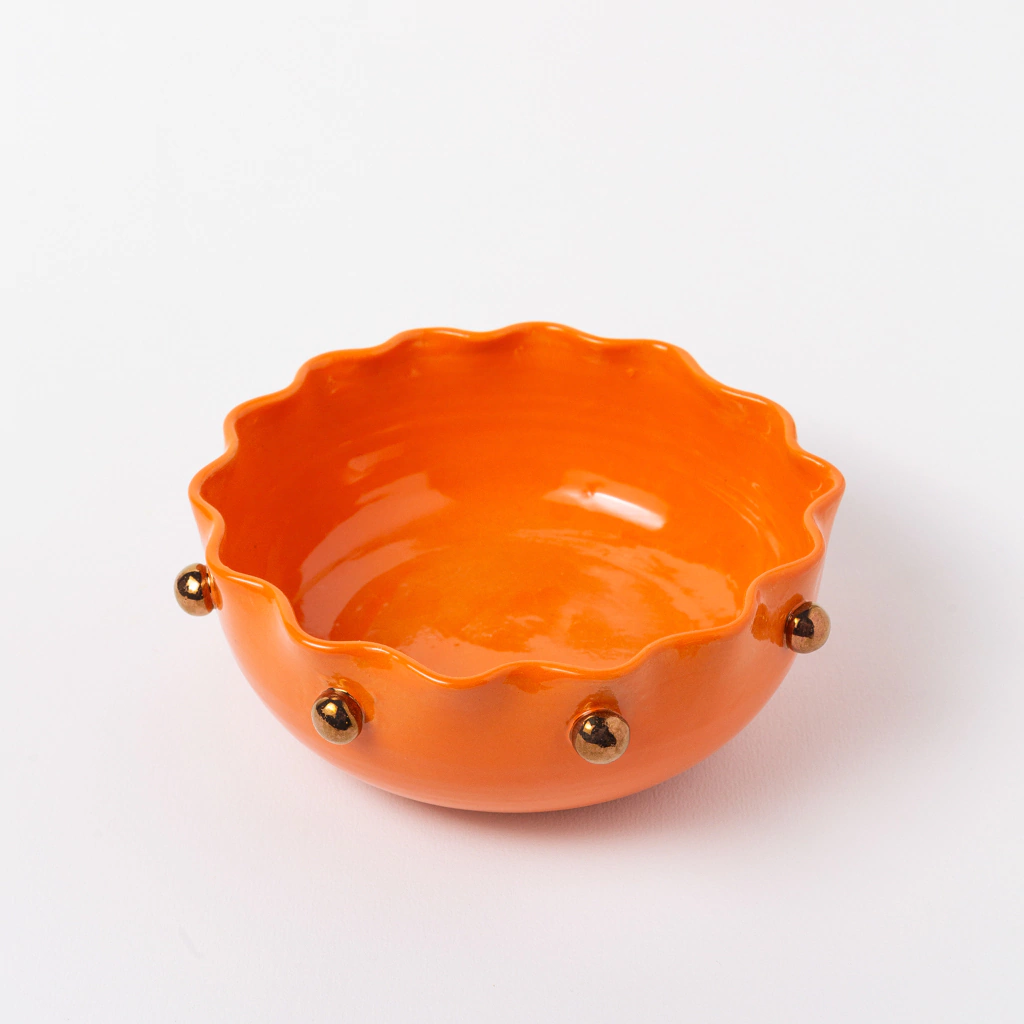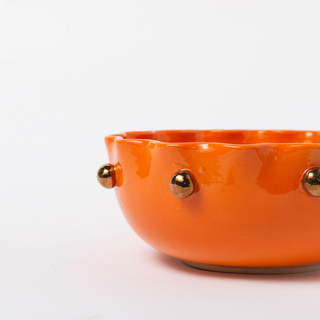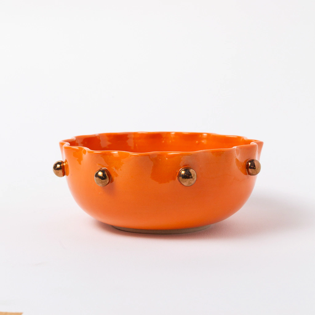 Bowl feito em cerâmica queimada em alta temperatura, com detalhes de bolinhas em ouro.