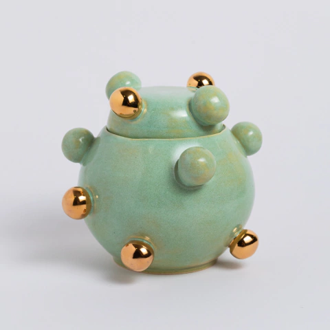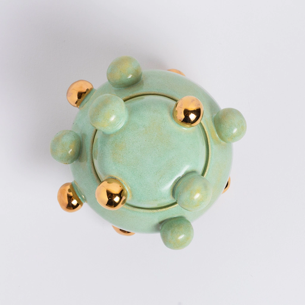 A Caixinha Bruxelas é uma das peças mais queridas por aqui — e com razão! Ícone do nosso ateliê, ela mistura forma orgânica com bolinhas esmaltadas em ouro 12k, criando uma estética divertida, elegante e inconfundível.