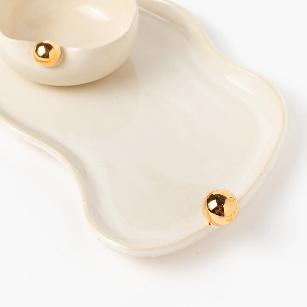 Cada peça é feita à mão em cerâmica de alta temperatura e finalizada com esferas douradas aplicadas manualmente — um detalhe sofisticado e único.