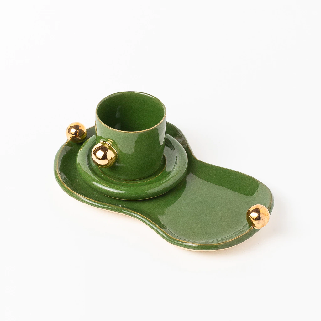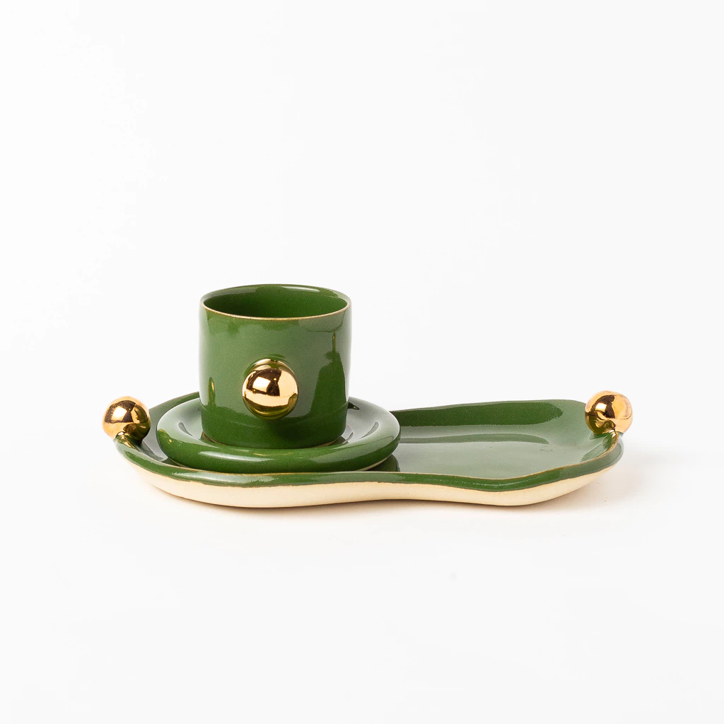 Cada peça é feita à mão em cerâmica de alta temperatura e finalizada com bolinhas douradas aplicadas manualmente, um detalhe sofisticado que torna cada unidade única.