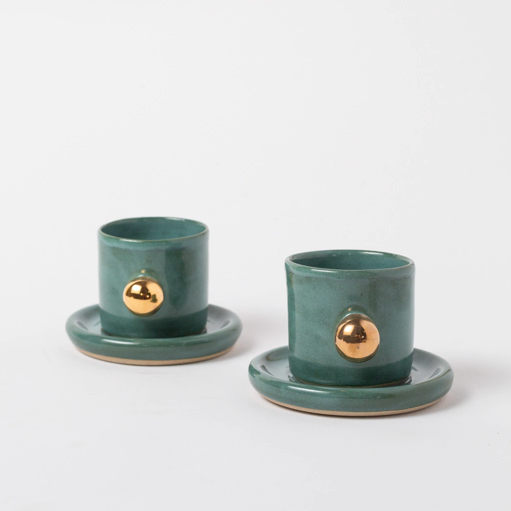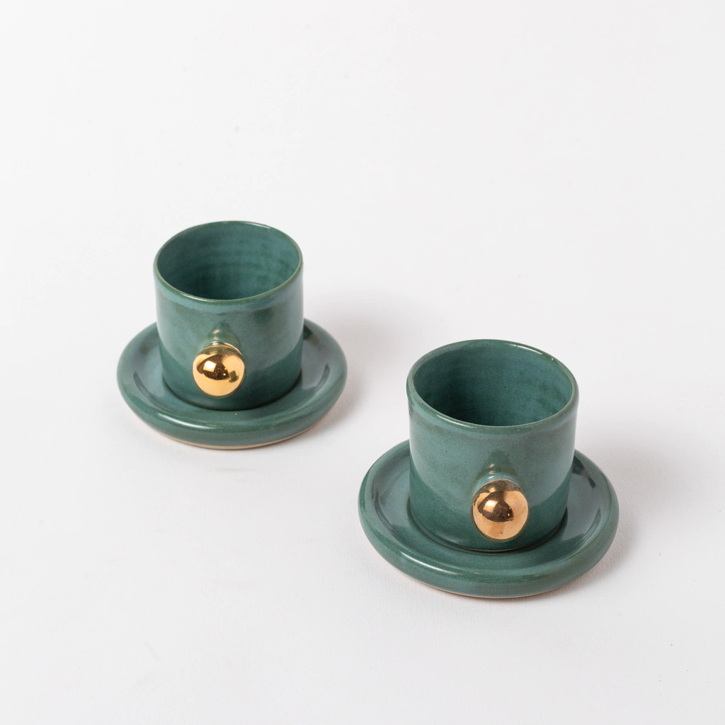 Jogo Xícara Lina com duas peças (2 xícaras e 2 pires) com ouro 24k é a peça perfeita para compor aquele cantinho do café com muito charme.