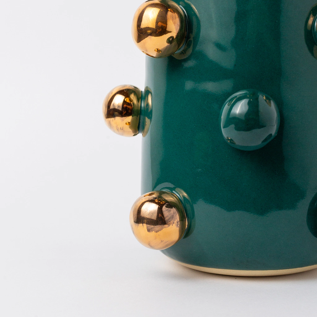 Um dos nossos best sellers, o Vaso Nina já se tornou um clássico da Marô Antunes. Com bolotas aplicadas manualmente — metade esmaltadas em ouro 24k — e o tom intenso de turmalina, ele é a união perfeita entre ousadia e sofisticação.